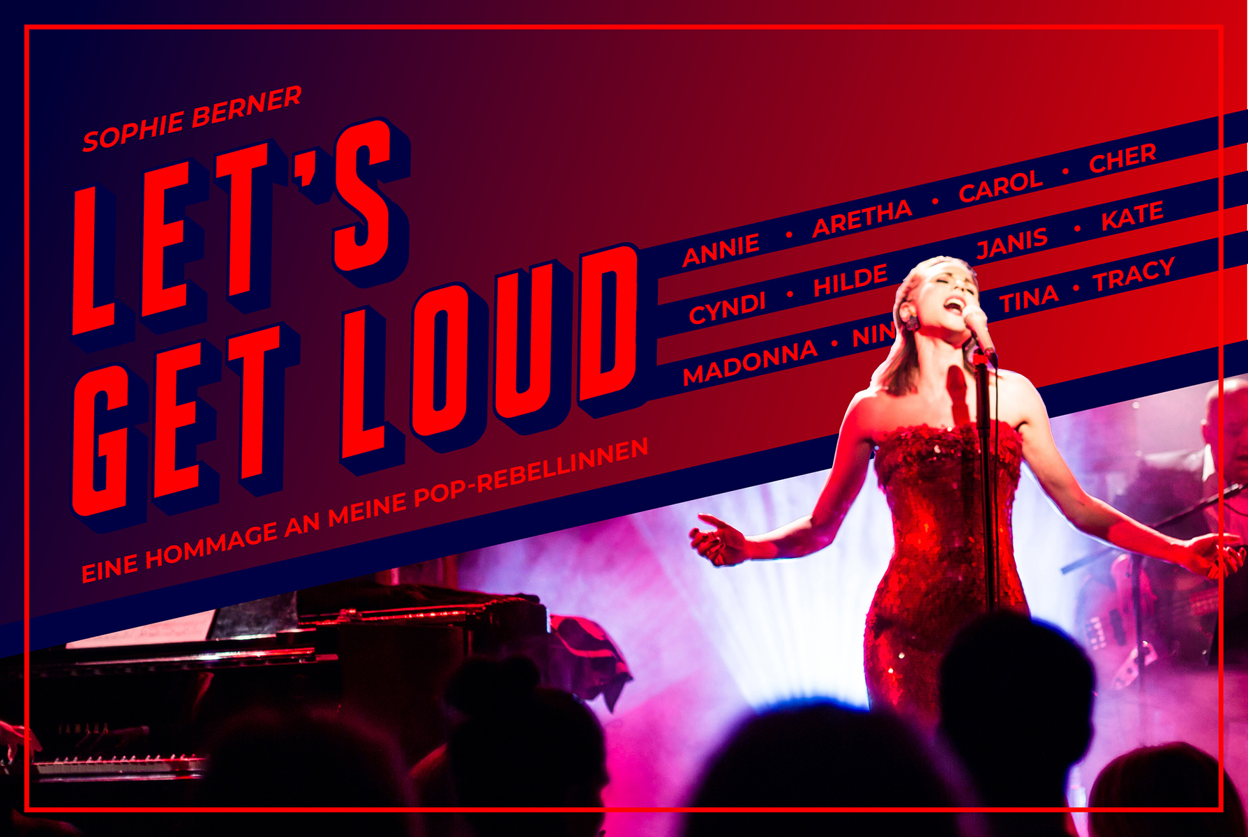 "Sie waren talentiert, leidenschaftlich, sie setzten neue Maßstäbe – viele, die heute zum Kanon des Pop gehören, galten in ihren Anfängen als rebellisch - allein schon, weil sie weiblich waren. Mittlerweile haben Künstlerinnen wie: Madonna, Cher, Donna Summer, Kate Bush, Hildegard Knef, Aretha Franklin, Nina Simone, Janis Joplin, Cyndi Lauper und viele mehr, Generationen von Musiker:innen geprägt – und auch mich. Ihr Engagement, ihr Mut zum Lautsein, ihre Songs inspirierten mich und prägten meinen Weg zur Sängerin. Songs wie Respect, Von nun an geht ́s bergab,Girls just wanna have fun, Mercedes-Benz, Babooshka, Feeling good - sind zu Lebensbegleitern geworden, zu Herzpflaster und Steh-auf-Songs. Deswegen ist es an der Zeit, diesen unbeschreiblichen Powerfrauen ein Programm zu widmen. Mit einer eigens für dieses weibliche Programm zusammengestellten Männer-Band." (Sophie Berner)